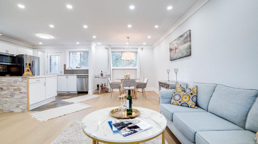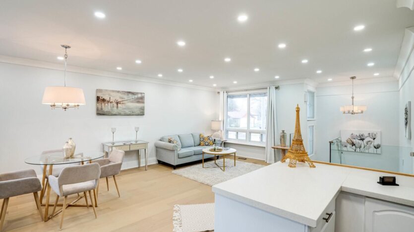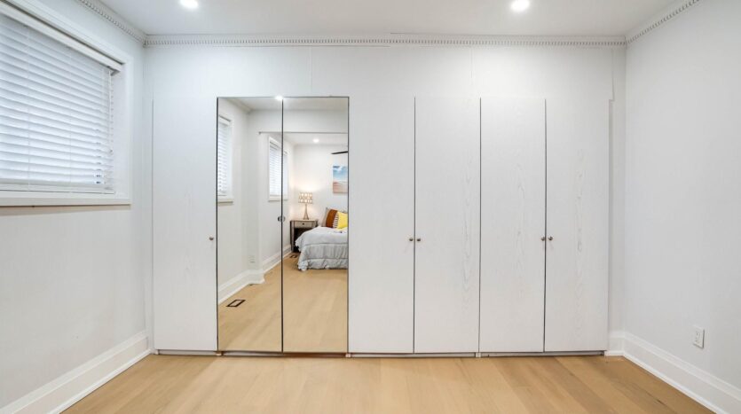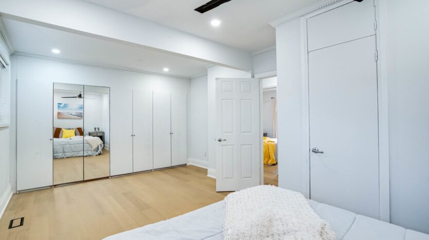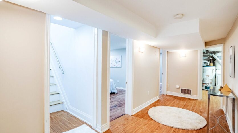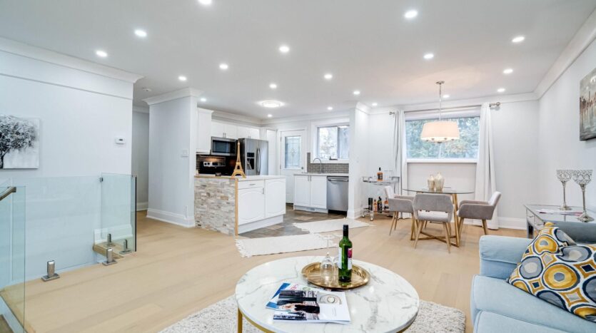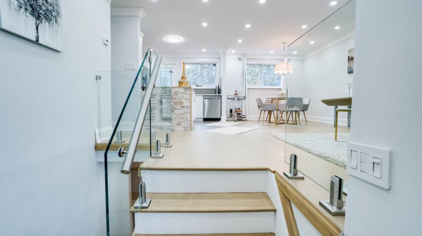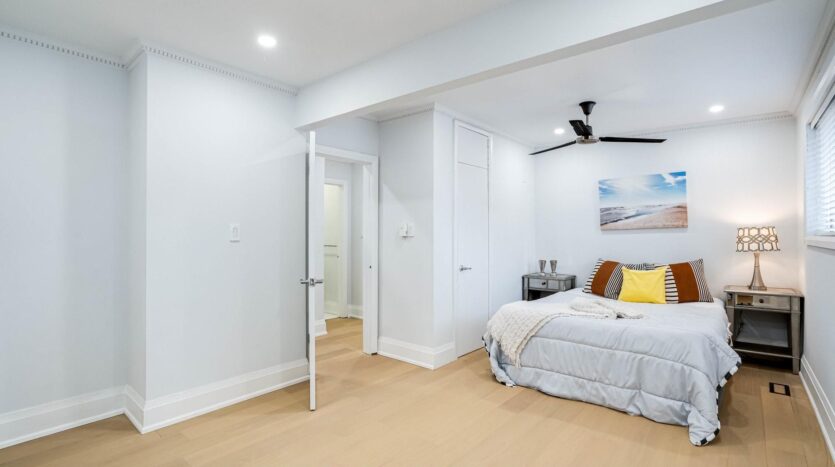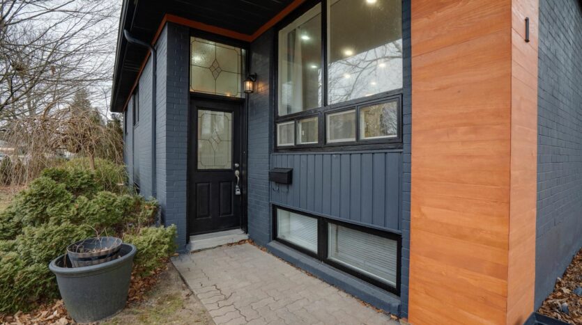Solid brick bungalow tastefully updated in 2022, offering a bright open layout on a wide 70-ft lot. The fully fenced backyard is large enough for a pool and surrounded by mature trees, providing privacy and excellent possibilities for future use or redevelopment. Renovations completed in 2022 include engineered hardwood flooring, pot lighting, modern glass and stainless-steel railings, fresh paint, and solid wood crown moulding and trim. The kitchen is equipped with stainless-steel appliances and opens directly to a generous deck, making outdoor dining and gatherings easy. The main floor currently features two well-sized bedrooms (previously three and can easily be returned to its original layout) along with a 3-piece bathroom. The finished basement adds three more bedrooms, another 3-piece bath, and plumbing rough-ins that could accommodate a future kitchen.