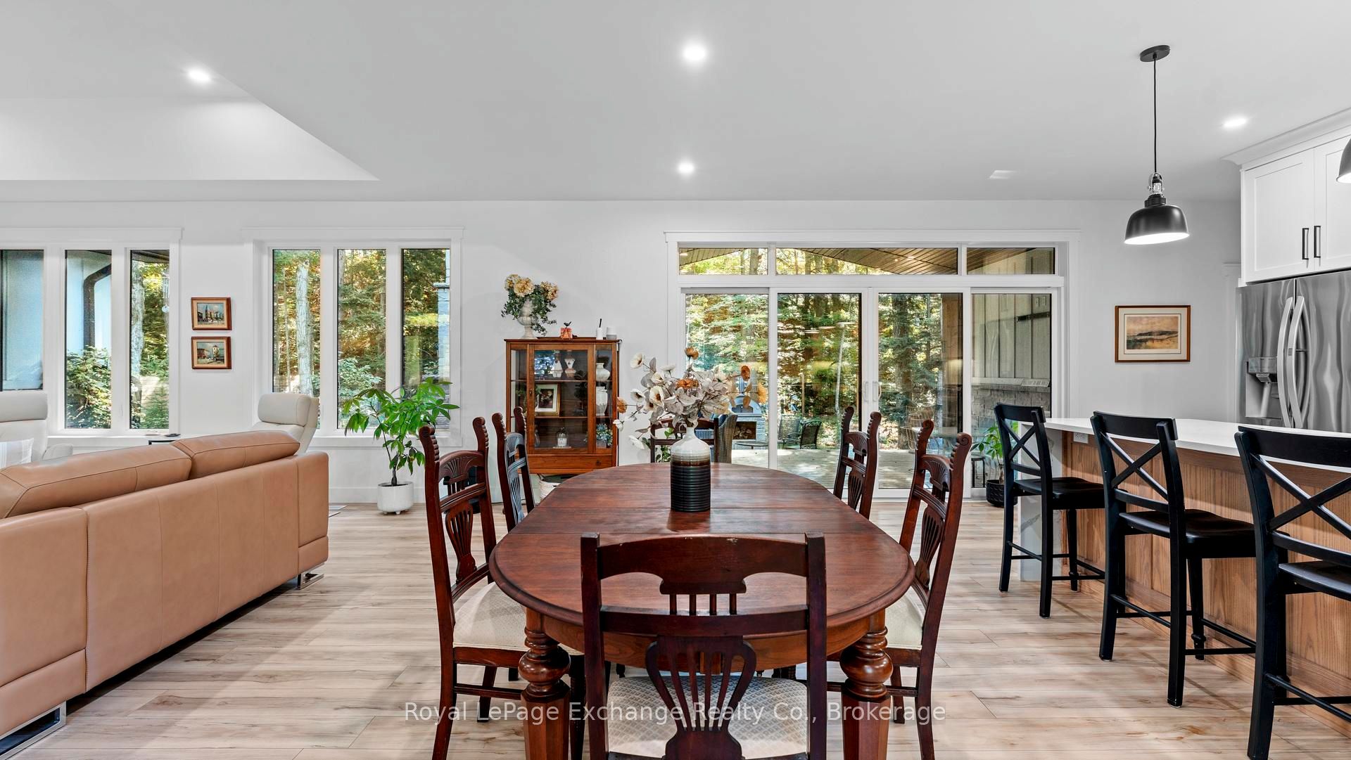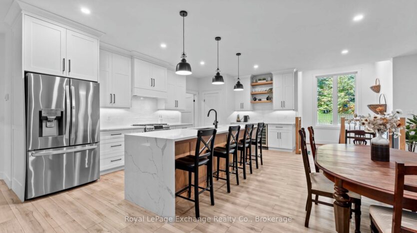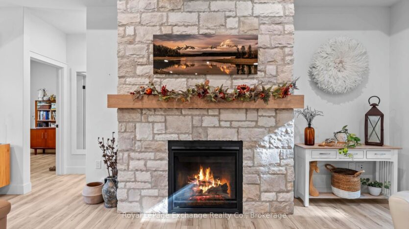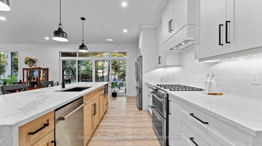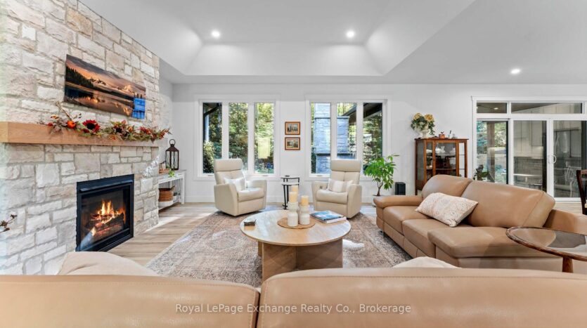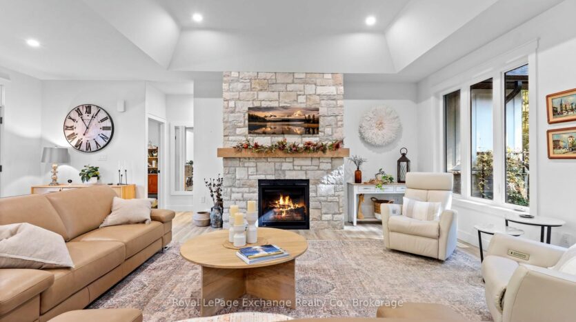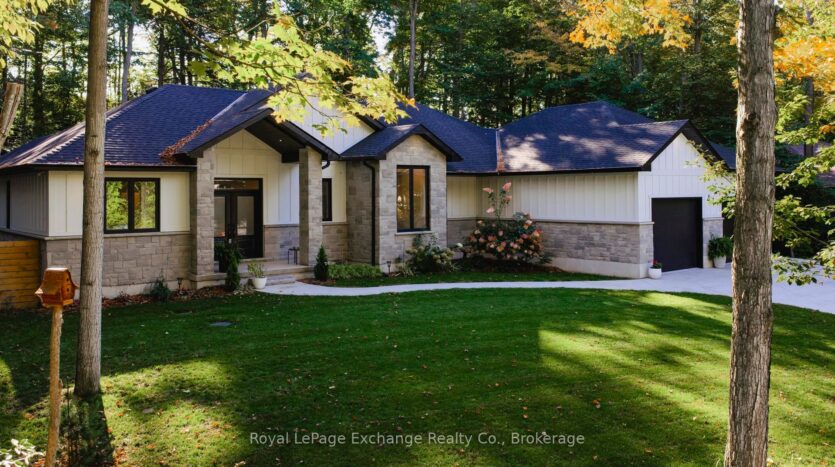 Welcome to 44 Blairs Trail serene retreat in the coveted lakeside community of Blairs Grove, where sandy shores and breathtaking sunsets over Lake Huron are just steps from your door. This 2021 custom-built bungalow, offers more than 3,400 sq. ft. of finished living space with 2,050 sq. ft. on the main floor and another 1,350 sq. ft. in the finished lower level. Set on a private half-acre, this home is a rare blend of luxury, craftsmanship, and comfort. Inside, soaring 9-foot ceilings on the main floor and oversized windows create a bright, open atmosphere. At the heart of the home, the chef-inspired kitchen boasts quartz countertops throughout, a 10-foot waterfall island, custom cabinetry, and a spacious walk-in pantry. The space flows seamlessly into the dining area and inviting great room with a cozy gas fireplace, then out to the covered rear deck (19 26)where a stone wood-burning fireplace and natural gas BBQ hookup invite year-round entertaining. The primary suite offers privacy and tranquility, while two additional bedrooms and a 4-piece bath create a separate guest wing. The lower level expands the living space with a recreation room, gas fireplace, billiards area, full bath, and two framed bedrooms allowing for up to six bedrooms in total. Every detail reflects superior construction: 9-inch poured concrete foundation walls, 2×6 framing with insulated sheathing for true thermal break, R-27 insulated walls, R-60 ceiling insulation, and 50-year Timberline shingles. The exterior shines with LP Smart Side maintenance-free Board and Batten siding accented by stone, and a fully fenced backyard with custom wrought iron railings. Just minutes from Kincardines amenities, dining, trails, and shops but tucked into a peaceful, tree-lined neighbourhood this home offers the perfect balance of modern functionality and lakeside serenity.44 Blairs Trail is more than a home its a lifestyle where quality, comfort, and coastal beauty come together.